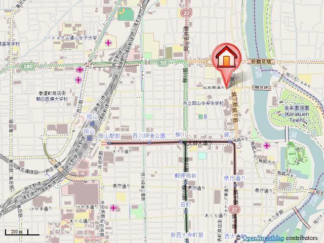 | 交通 | JR山陽本線「岡山駅」徒歩15分 東山線「城下駅」徒歩7分 東山線「柳川駅」徒歩10分 |