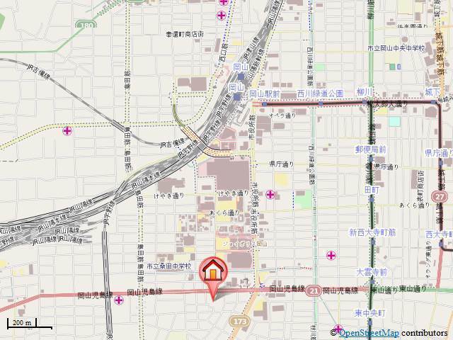 | 交通 | JR山陽本線「岡山駅」徒歩15分 清輝橋線「東中央町駅」徒歩12分 JR宇野線「大元駅」徒歩22分 |