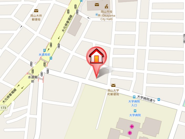 住所は岡山市北区鹿田町1丁目になります。