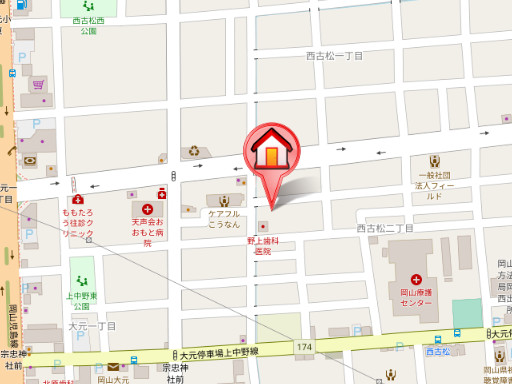所在地 | 岡山市北区西古松西町8-21 Bruno Bldg.1階 ![]() 大元駅より徒歩10分 |