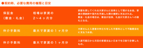 契約時には、さまざまな費用を支払うことになる。設定は物件によって異なるが、表に示したように、家賃の6ヶ月〜8ヶ月分が必要と思っておこう。最近では、敷金礼金0円という物件も多くなってきているので、初期費用を抑えたい場合はそういった物件が狙い目だ。入居時に火災保険などに加入することが義務づけられる場合もある。どんな名目でいくら必要なのか、申し込む際に確認して準備を始めよう。