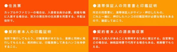 契約時に提出しなければならない書類も、前もって聞き出して審査の間に手配しておきたい。何が必要になるかは、物件や大家さんによって異なるが、おおむね共通しているのは以下に上げるものだ。