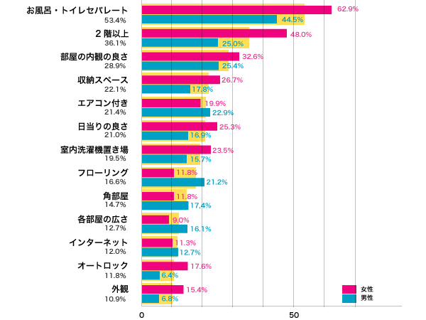 契約する部屋を選ぶときに、キメテになった建物や部屋の設備・仕様はどんなものでしょうか。キメテのトップは、「バス・トイレ別」毎日使うところだからこそ、迷ったときの「キメテ」になったのでしょうか。男女ともそれぞれ2位以下を大きく引き離してのダントツ1位に挙げられているのが特徴的です。これは、どんなところを重要視して部屋を選ぶかというときにも、トップだったので、絶対ハズせないことのようですね。バス・トイレが一緒になったユニットバスは、小さなスペースにコンパクトに収まるため、専有面積の小さい物件ほど使われています。最近は、需要が多くなった事でユニットタイプは少なくなってはきているものの、一人暮らしの部屋探しでは結構な確率で出会う部屋なのかも知れません。