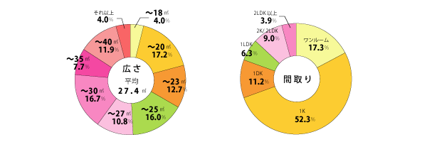 部屋探しのキメテ部屋探しには妥協も多少は必要かもしれません。自分の住みたい部屋の優先順位は最初から決めておくとよいでしょう。さて、他の人々は何をキメテに部屋を決めたのでしょうか。キメテになった部屋の設備など契約する部屋を選ぶときに、キメテになった建物や部屋の設備・仕様はどんなものでしょうか。キメテのトップは、「バス・トイレ別」毎日使うところだからこそ、迷ったときの「キメテ」になったのでしょうか。男女ともそれぞれ2位以下を大きく引き離してのダントツ1位に挙げられているのが特徴的です。これは、どんなところを重要視して部屋を選ぶかというときにも、トップだったので、絶対ハズせないことのようですね。バス・トイレが一緒になったユニットバスは、小さなスペースにコンパクトに収まるため、専有面積の小さい物件ほど使われています。最近は、需要が多くなった事でユニットタイプは少なくなってはきているものの、一人暮らしの部屋探しでは結構な確率で出会う部屋なのかも知れません。男女の違いを見てみると、さらに興味深いことがわかります。男性の4位は「エアコン付き」、5位は「フローリング」。イマドキのおしゃれな20代シングル男性にとって、もはや「エアコンなしの和室」はありえないのでしょうか。また、女性の6位「室内洗濯機置き場あり」、8位「オートロック」は、男性のほうではあまりキメテにはなっていません。女性は防犯に対する意識が高いのです。さらに「建物の外観のよさ」が15.4%と上位にあるように、室内だけでなく外からの見た目も重視する傾向がみられます。イマドキ社会人の選択では、実際、どんな部屋に住んでいるのでしょう?一人暮らしをしている友達の部屋に行ったら、意外とイイ感じで、つい「ここ、いくらかな?」なんて値踏みしてしまう・・・そんな経験ありませんか?一人暮らしの人にとって、やっぱり気になるのは「家賃」のこと。一体家賃って、いくらくらいが普通なのでしょう?20代の一人暮らしの家賃の平均は6万5723円という結果が出ています。エリアによって地価が違うので、詳しくは違ってきます。首都圏の平均家賃が7万414円なのに対し、関西では5万8705円、東海では5万4388円。首都圏が1万2000円〜1万5000円高い傾向にあります。ちなみに、家賃の目安は「収入の3分の1以内」といわれていますが、この平均家賃でちょっと計算してみましょう。6万5723円×3=19万7169円。つまりこの6万5723円という平均家賃は、月収20万円以上、年収なら240万円以上あればOKラインといえますね。年収のデータを見ると、200〜300万円未満が30.6%、300〜400万円未満が27.8%。これくらいの年収でこの平均家賃は十分OKライン。みんなムリせず、堅実な賃貸ライフを送っているんですね〜。家賃を決める要素はたくさんありますが、そのうちのひとつが広さです。そりゃぁ広いにこしたことはないけど、広ければ家賃も当然アップしますから、どれくらいの広さがいいのかわからなくなりますね。一人暮らしの部屋って、どれくらいの広さが普通なのでしょうか?専有面積の平均は、27.4m2。そして間取りは1Kが50%以上を占めるというデータから考えると、20代一人暮らしは下の間取り例のような「キッチン+7〜8畳」くらいが平均像だ。これくらいの1Kなら、ベッド、テーブル、テレビ、パソコンなどが十分置けますね。