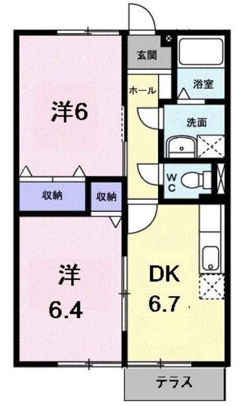 | 共益費:2,200円 | 専有面積:46.13㎡ 間取り詳細:洋室 6帖,洋室 6.4帖,DK 6.7帖 |