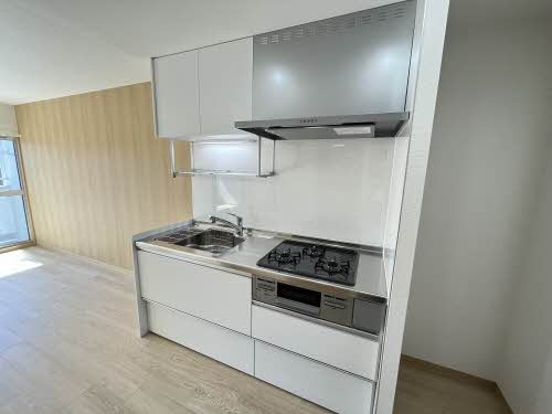 二人入居可、システムキッチン、給湯、シャワー付洗面化粧台、駐輪場あり、角部屋、温水洗浄便座、浴室乾燥機、洗面所独立、クローゼット、水道(公営)、ガス(プロパン)、排水(浄化槽)、バス・トイレ別、シャワー、コンロ(三口)、エアコン、室内洗濯機置き場、バルコニー、フローリング、インターネット対応(光ファイバー)、TVドアホン、インターネット使用料無料、最上階、礼金無し、敷金なし