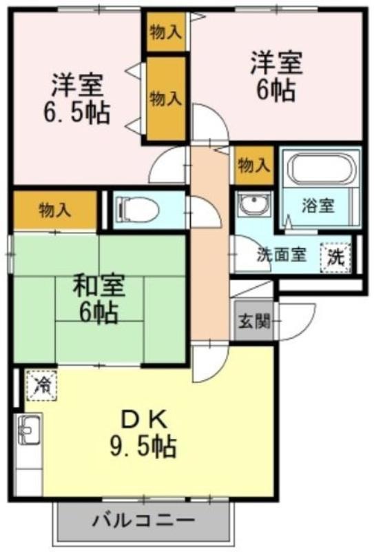 | 共益費:4,500円 | 専有面積:65.46㎡ 間取り詳細:和室 6畳,洋室 6.5帖,洋室 6帖,DK 9.5帖 |