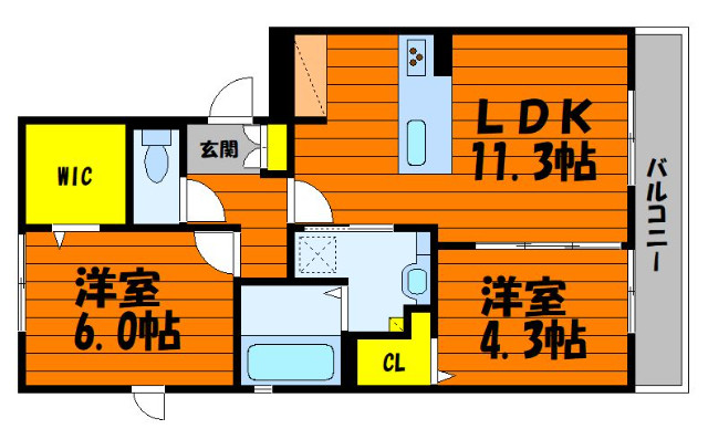 | 共益費:6,000円 | 専有面積:53.78㎡ 間取り詳細:洋室 4.3帖,洋室 6帖,LDK 11.3帖 |