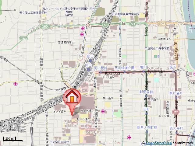 JR山陽本線「岡山駅」徒歩10分 東山線「岡山駅前駅」徒歩12分 東山線「西川緑道公園駅」徒歩16分 |