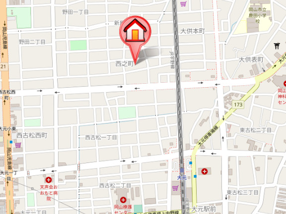 JR宇野線「大元駅」徒歩10分 JR山陽本線「岡山駅」徒歩分 清輝橋線「東中央町駅」徒歩23分 |